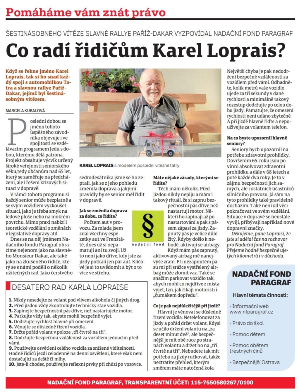 Nadačnímu fondu Paragraf exkluzivně poskytl rozhovor šestinásobný vítěz slavné rallye Paříž Dakar Karel Loprais. Jak se mimo jiné v rozhovoru dočtete, je Karel akční i v důchodu, kdy se aktivně angažuje ve vzdělávacím programu „Jedu s dobou“, kterého je patronem. A jaké má Karel zásady? To se dočtete v jeho „DESATERU RAD KARLA LOPRAISE“.